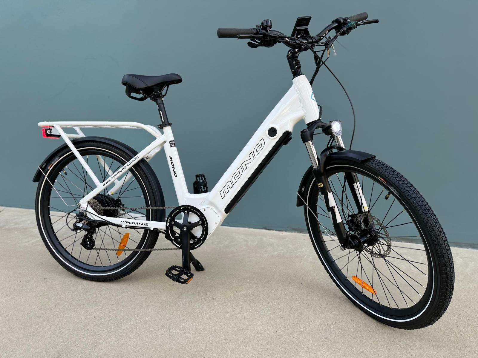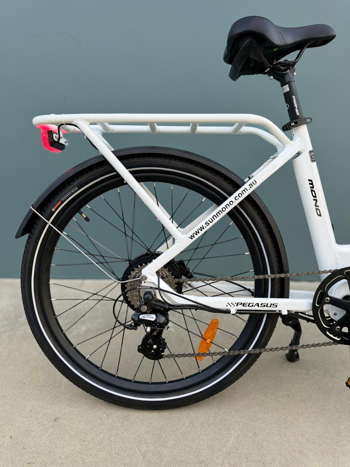 Introducing the E-MONO PEGASUS, our new urban design e-bike that can take you anywhere you want to go. With its rugged build and wide 26 x 2.125” puncture-resistant tires, this bike can handle any terrain. The 48V 15 AH fully integrated battery provides plenty of power for your ride. E-Mono PEGASUS makes take-offs easy and safe. This bike is ready to hit the road with standard lights, a strong 25kg rated cargo rack, and mudguards. Whether you're a delivery rider, commuting to work, or just need a safe and high-performance step-through bike to get around town, the E-MONO PEGASUS is the right choice for you. Visit your nearest dealer today and take it for a ride!