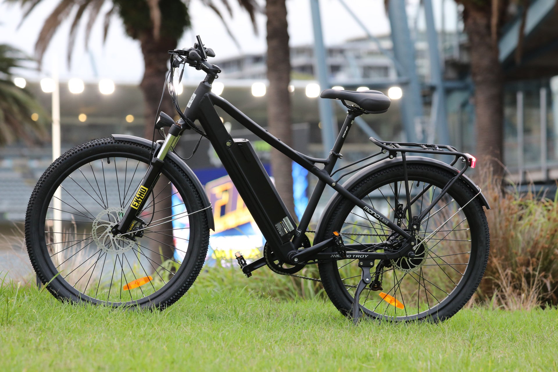 Experience the ultimate fusion of urban functionality and trail-ready performance. The Troy EQP isn’t just a city commuter; it's an all-terrain adventurer. Equipped with robust alloy mudguards, it's ready to tackle both bustling city streets and rugged fire trails. The integrated lighting system ensures visibility and safety, whether you're navigating through urban landscapes or exploring off-road paths. The added rear rack enhances utility, while the 100mm front suspension offers a smooth, responsive ride across diverse terrains. Perfect for the versatile cyclist seeking a bike that excels in versatility, the Troy EQP is your companion for every journey, from daily commutes to weekend explorations.